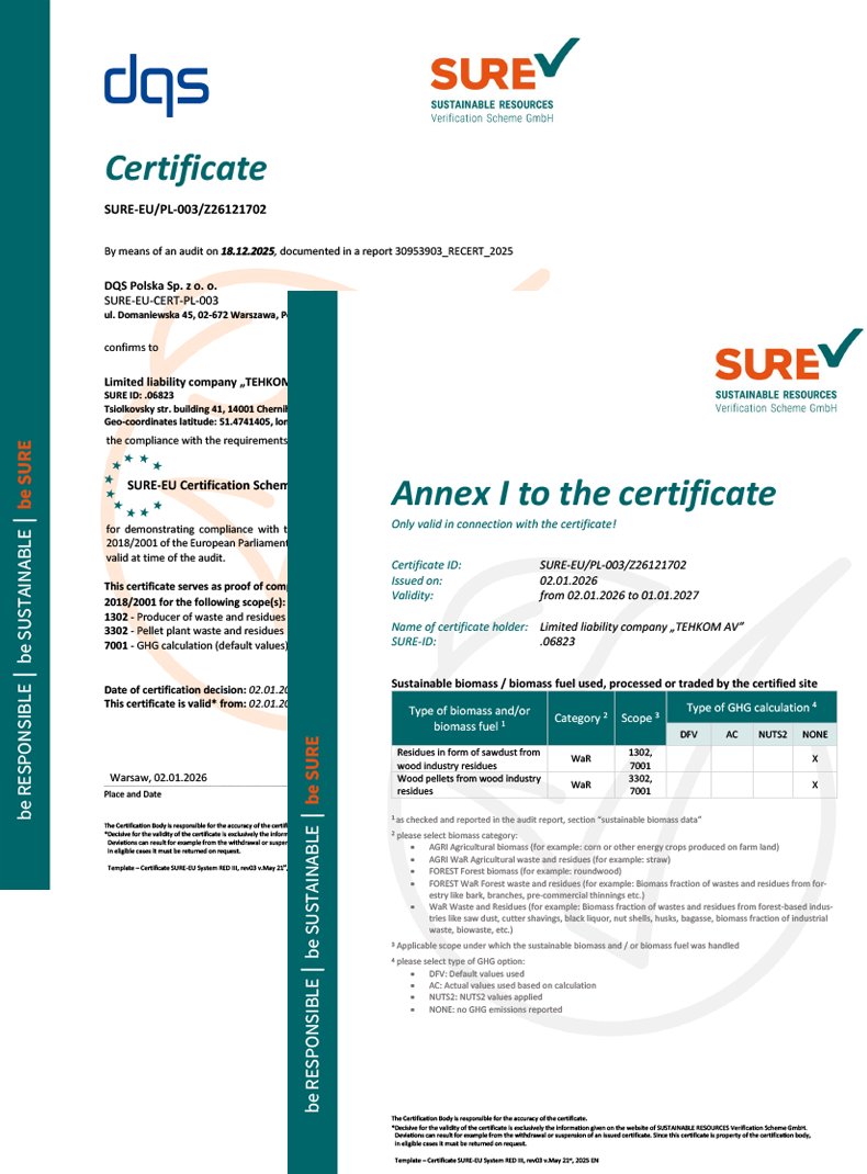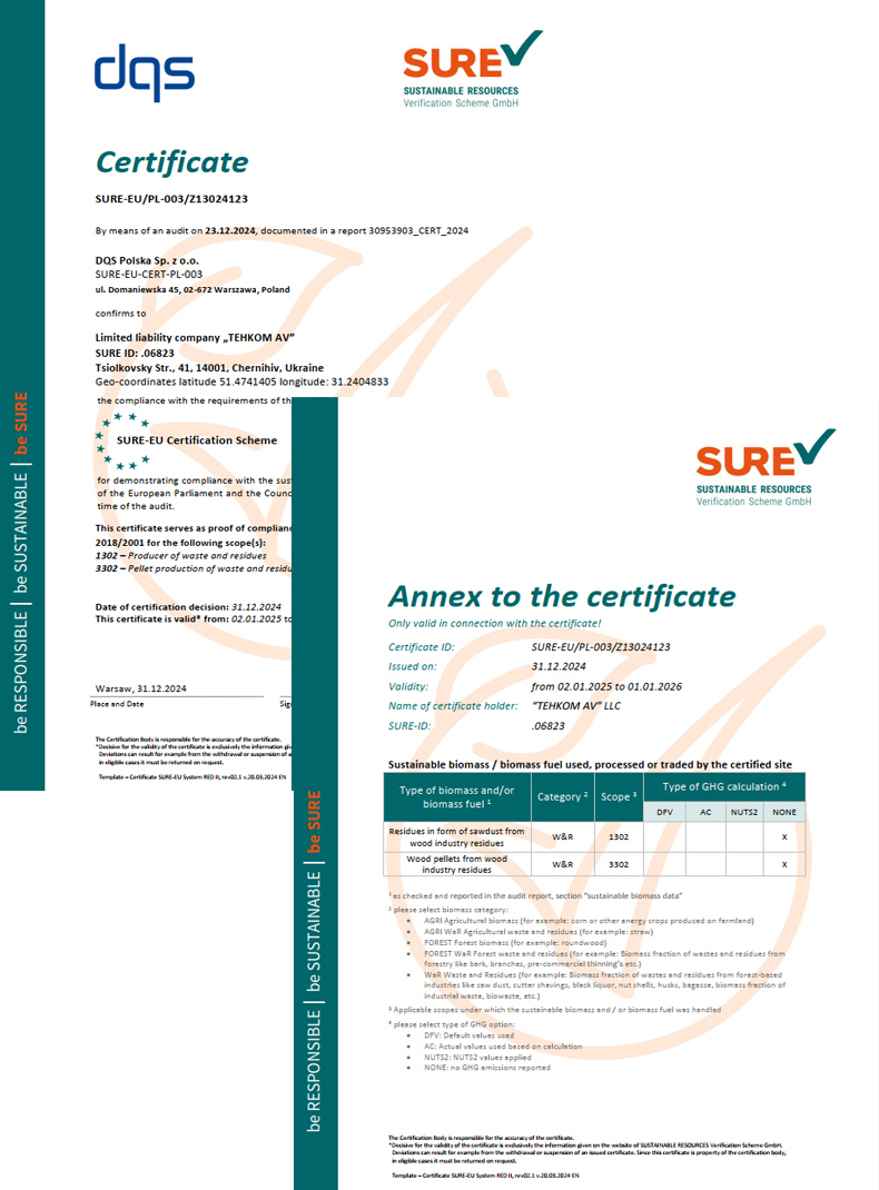 Компанія випускає сертифіковану паливну гранулу, що відповідає найвищим європейським стандартам, отримавши сертифікат від SURE-EU Certification Scheme GmbH.
